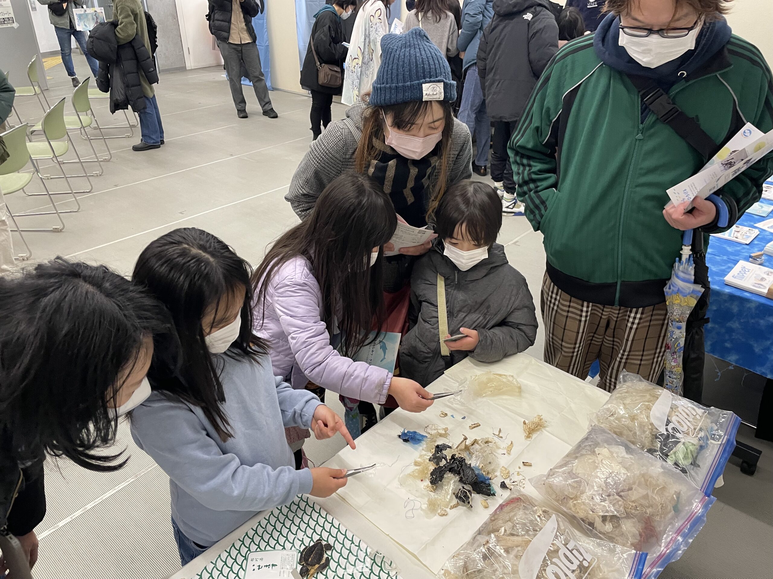 当日は、海岸に漂着したウミガメのお腹から出てきた海洋ゴミを展示し、実際に見て、触れていただきました。「えぇ?これがウミガメのお腹から出てきたの?」と驚き、独特のニオイに鼻をつまむ子ども達の顔が印象的でした。海洋ゴミの7.8割は市街地からやってきたものと言われています。自分たちの生活から出たゴミが、海洋生物たちに与えている影響を、実感していただけたのではないかと思います。