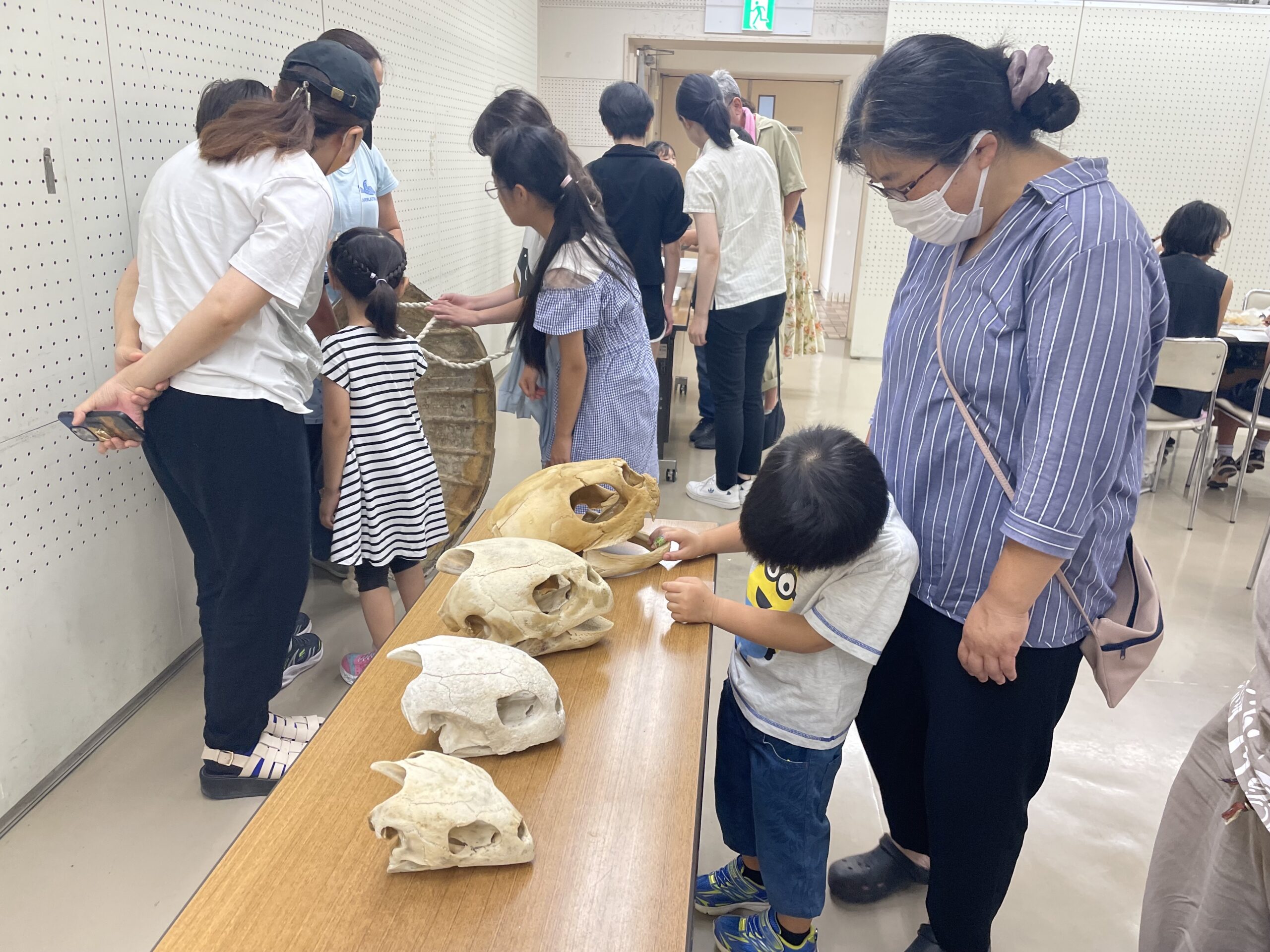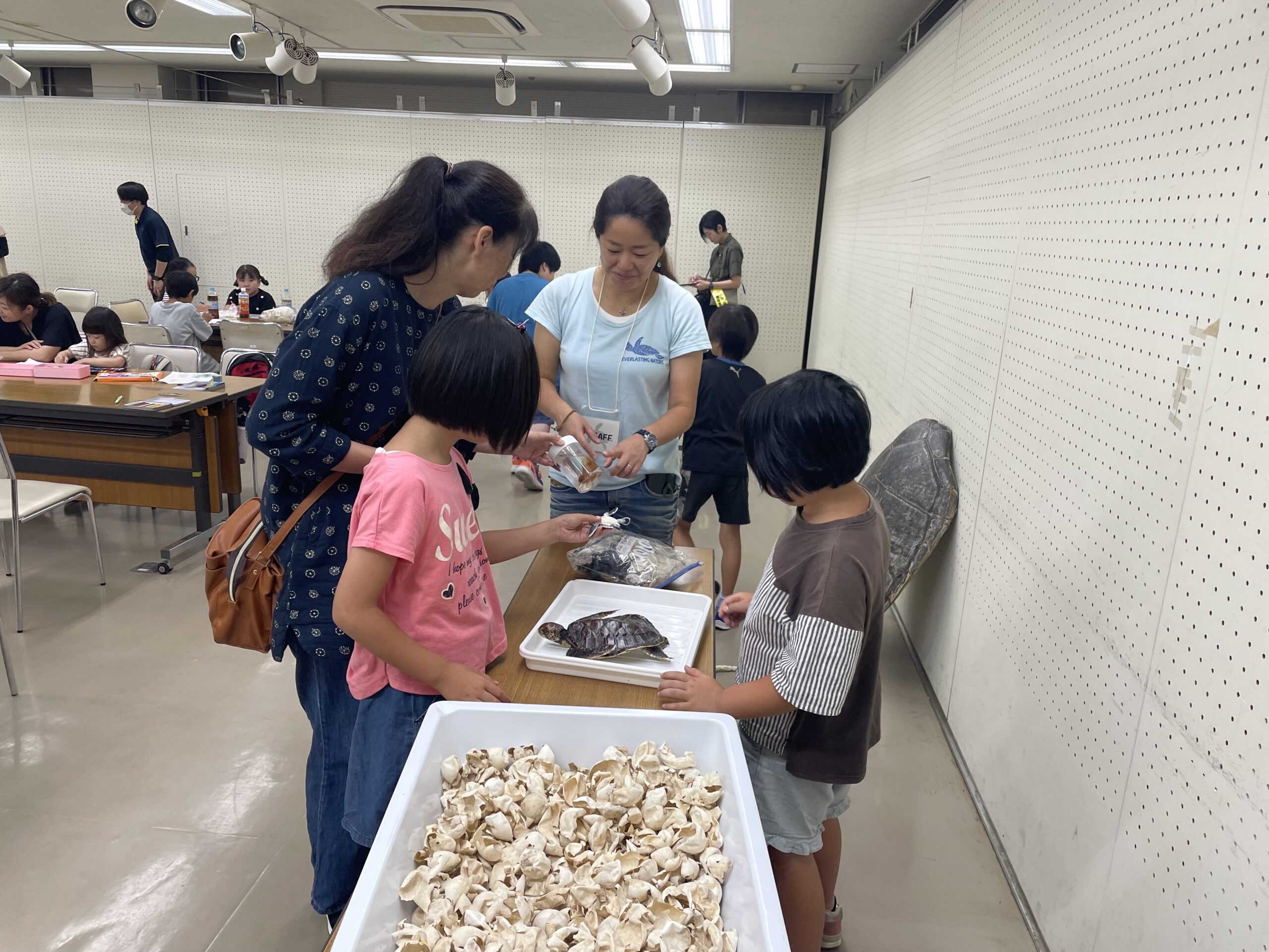 アオウミガメの大きな背甲やウミガメ各種の頭骨、ウミガメ卵のふ化殻、ウミガメが誤食したゴミなど、標本に実際に手に触れることはとても好評でした。ゴミは洗ってはいるもののやはり独特なニオイが残っています。ニオイに耐えられず、鼻をつまみながらゴミを観察しているお子さんもいて、五感を通した実体験は強く記憶に残るのではないかと改めて感じました。