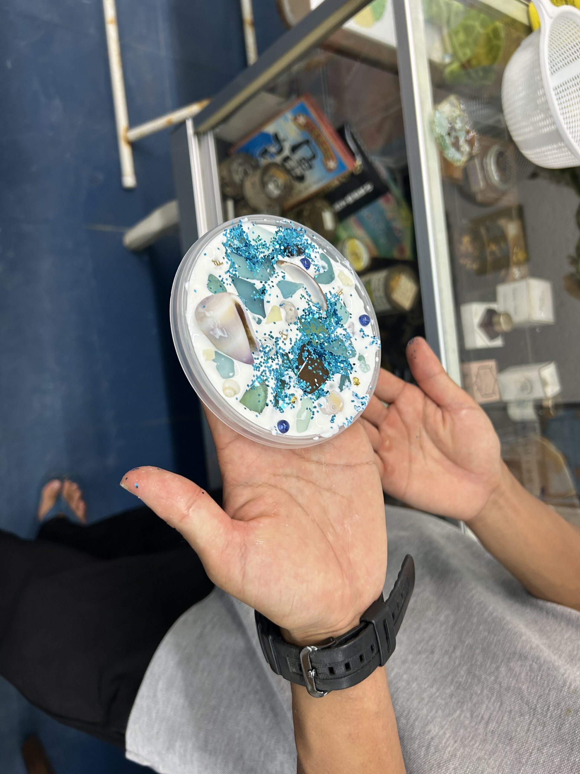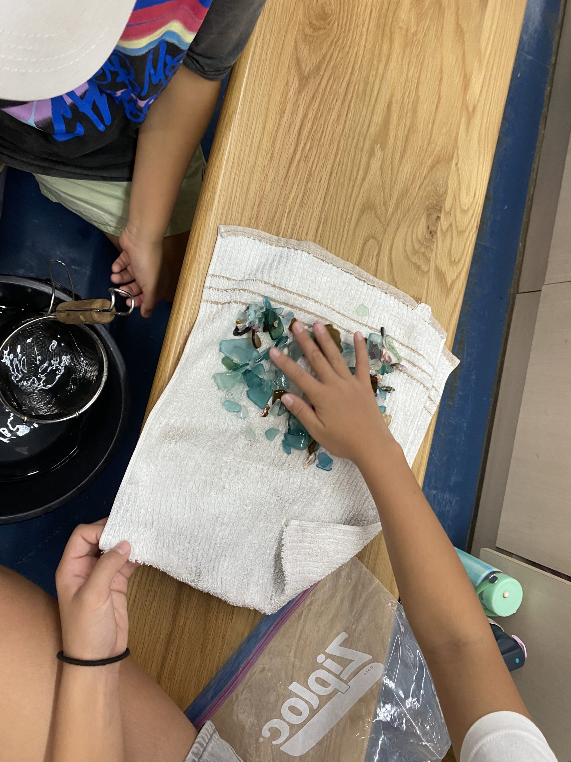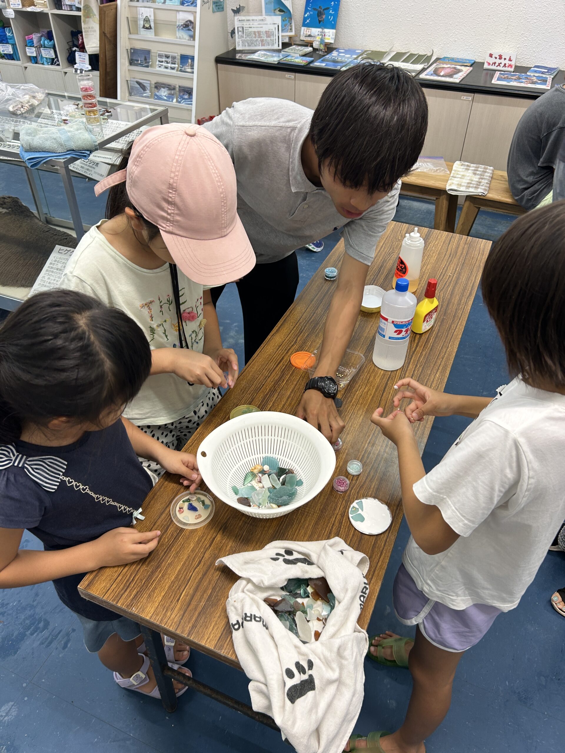 そして、ゴミ拾いの後のお楽しみは、海岸で見つけたシーグラスを使ったオーナメント作り。