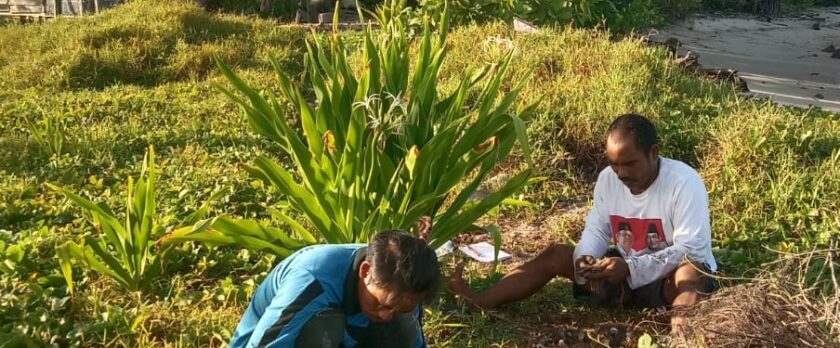 プナンブン島で現地監視員とともにふ化後の巣の調査を実施