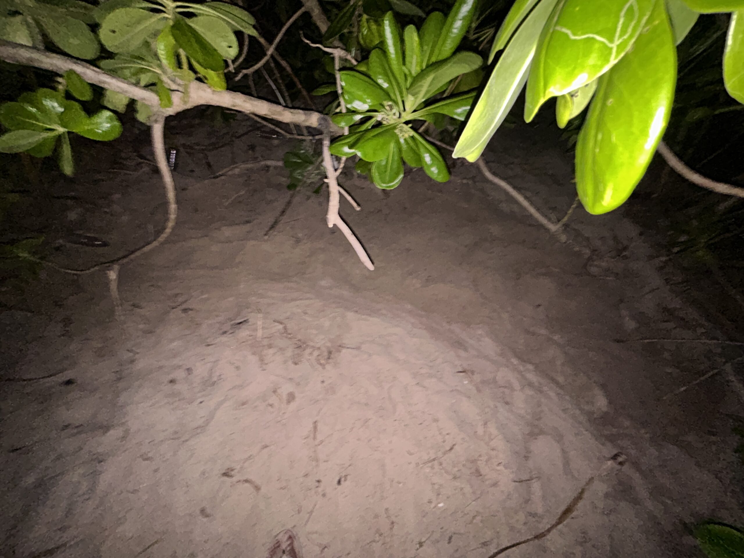 また、夜間パトロールをしていた際に見た、アオウミガメとの産卵巣の形の違いも印象に残っています。アオウミガメは通常深さ60cmほどの場所に卵を産み落とすため、多量に砂をかく必要があり、産卵の跡が小高いモコモコとした山のような形状となります。一方タイマイはだいたい40cm程度の巣を掘り、アオウミガメと比べると産卵の跡はのぺーっと平たいです。産卵し、砂を埋めて海に帰るまでアオウミガメは1~2時間を要しますが、私がプナンブン島で見たタイマイはものの30分ほどで海に帰っていきました。卵の大きさや産卵跡の平らさなど、全体的に「コンパクトなアオウミガメ」という印象を受けました。