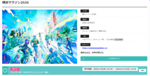 チャリティー枠(フルマラソン)の公募2026年4月8日(水)10:00~6月24日(水)23:59(先着)です。