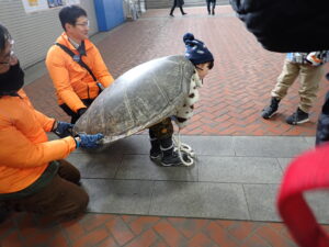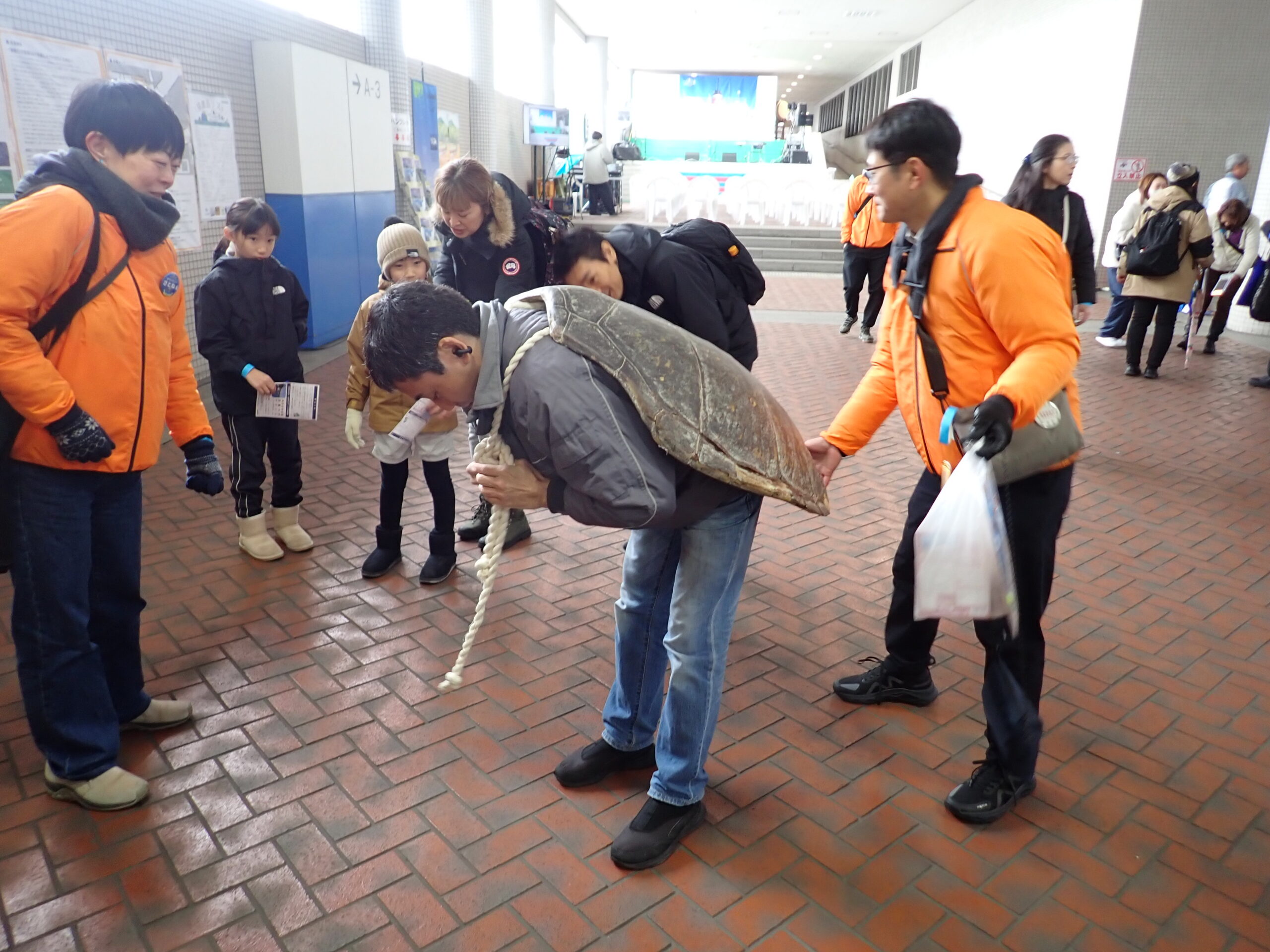 本物のウミガメの甲羅を背負えるコーナーが大人気!多くの方が笑顔で写真を撮りながら、ウミガメの存在を身近に感じてくださいました。
