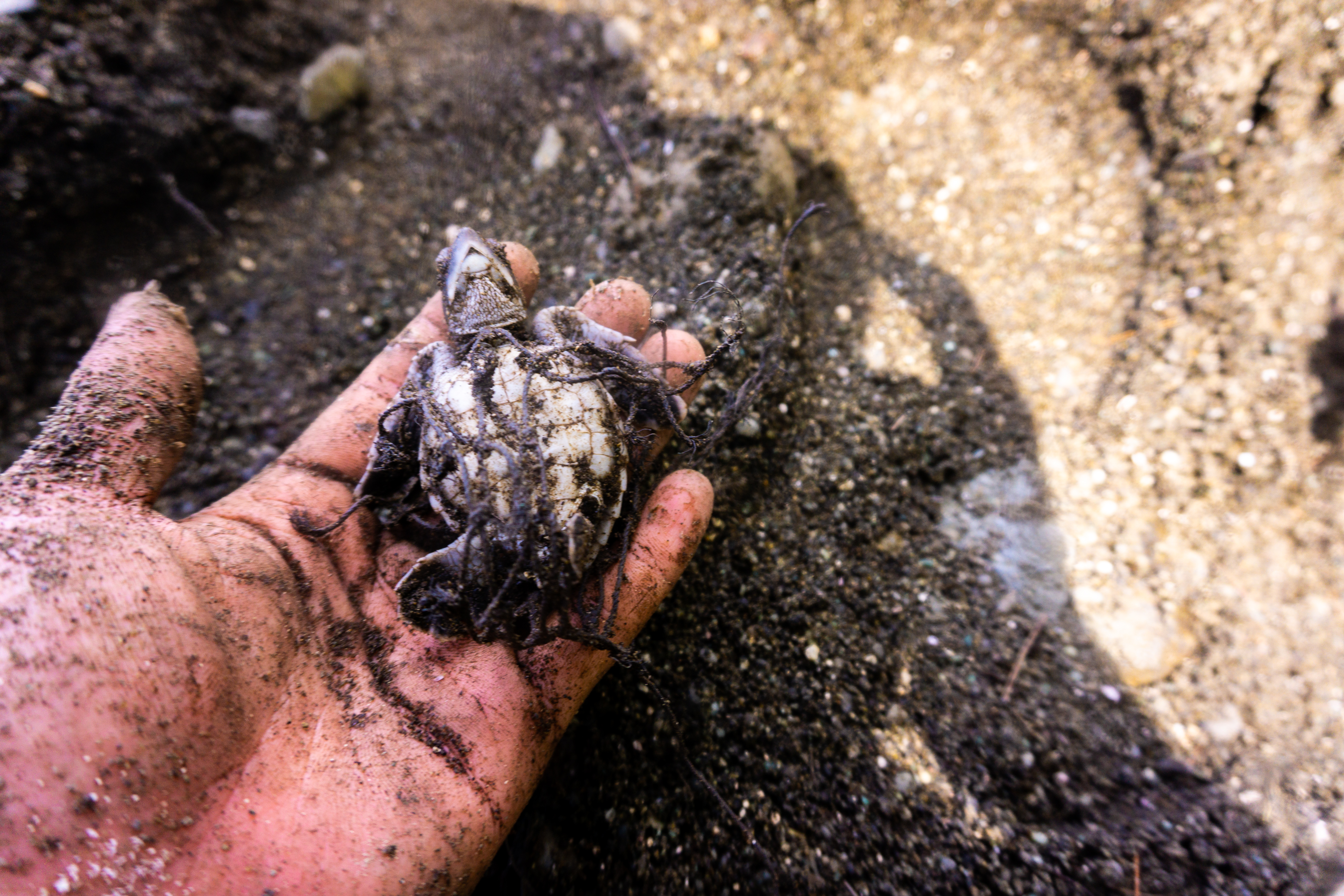 2019年は、父島列島で約1,500巣(前年比84%)、母島列島で約600巣(前年比120%)、聟島列島で約40巣(前年比134%)のアオウミガメ産卵巣が確認できました。父島列島では2016年から3年連続の減少となりましたが、小笠原のアオウミガメの増加傾向は継続していると推測しています。合計約1,000巣に対して、ふ化後のふ化率調査を実施したところ、父島列島では約43,700頭の子ガメが海に帰っていったと推測されました(母島列島および聟島列島では、ふ化率データが不十分なため算出不可)。理論的な脱出率(卵数に占める脱出子ガメの割合)は父島列島で約32%となります。今年は大型台風が襲来しました(風速50m/s以上の暴風は13年ぶり)。大型台風の襲来は、海岸生態系における攪乱の1つと考えており、健全な生態系の維持には必要不可欠なイベントとなっています。高潮の影響により産卵巣が水没したり、大量のゴミや流木がふ化前の産卵巣の上に堆積するような状況は一見するとアオウミガメにとって良くないように感じるかもしれませんが、それらが本当に個体群全体に害を及ぼしているのか、俯瞰的視点をもって考えることも重要となってきます。